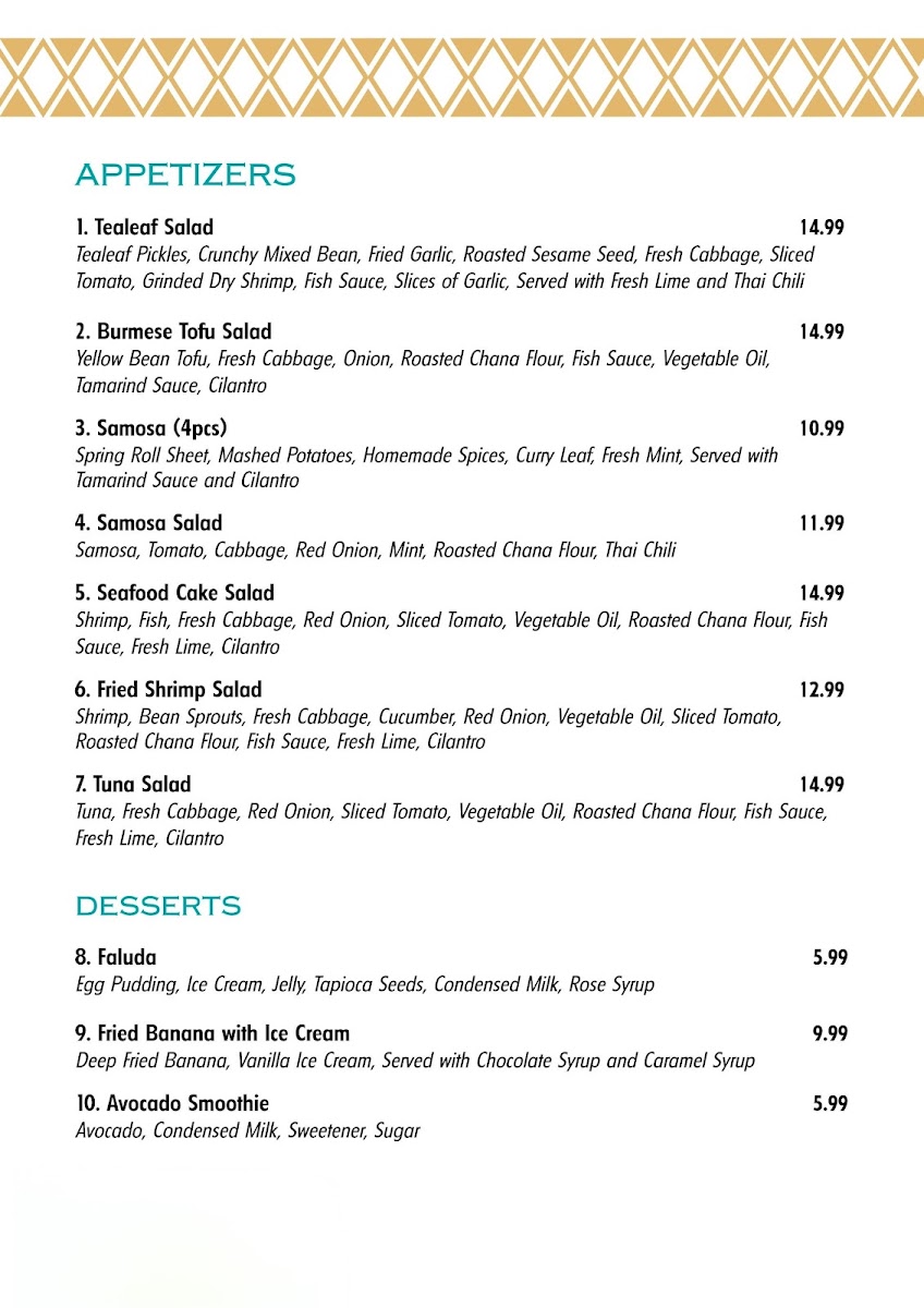 Noodle lovers have plenty of options, including the Khauk Swe Thoke (Burmese Noodle Salad), Nangyi Thoke, and the Pan Tay Noodle. For a comforting and hearty meal, the Garlic Noodle and Mohinga (Burmese Fish Chowder Soup) are wonderful choices that showcase traditional Burmese flavors.