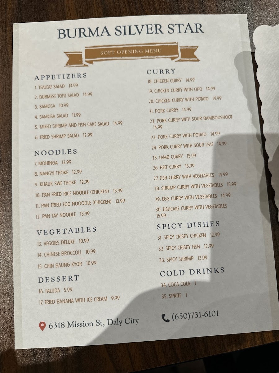 With such a diverse menu, Burma Silver Star Restaurant offers something for everyone, whether you're in the mood for a light bite, a spicy kick, or a comforting meal.