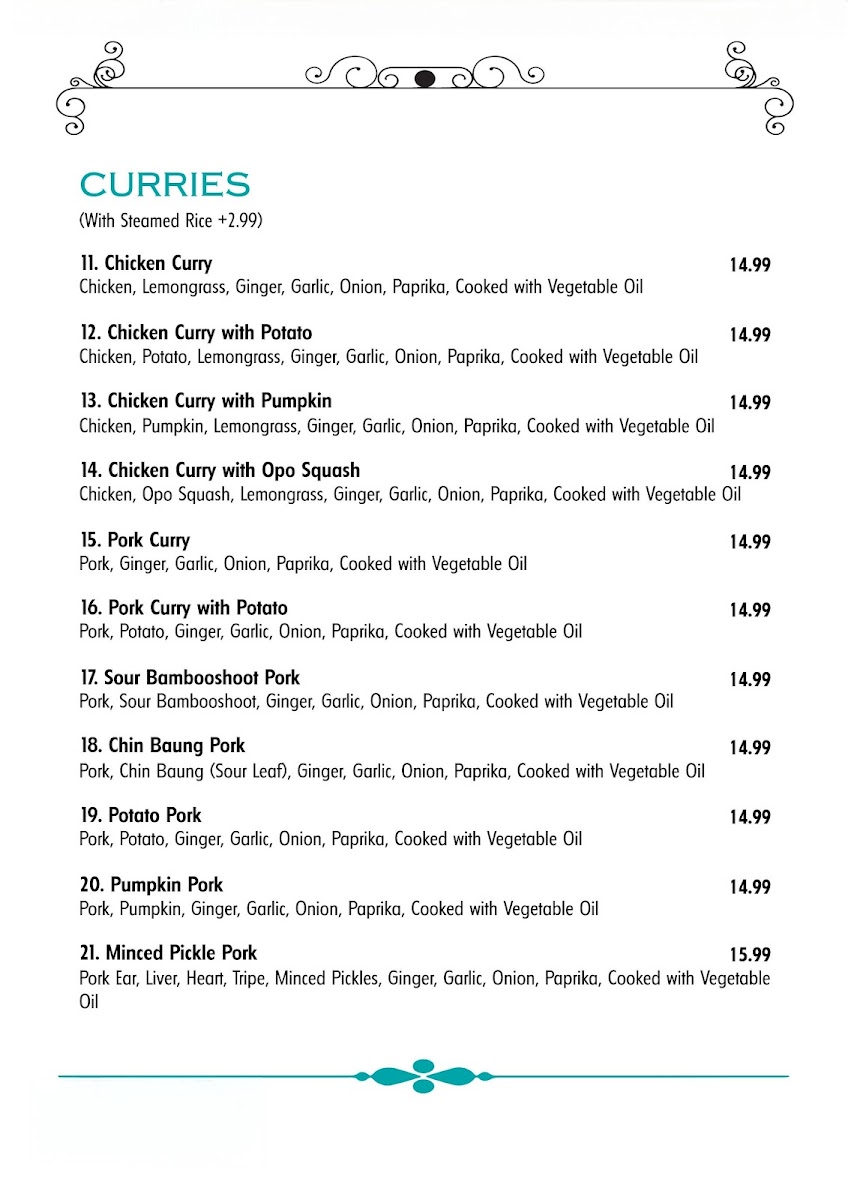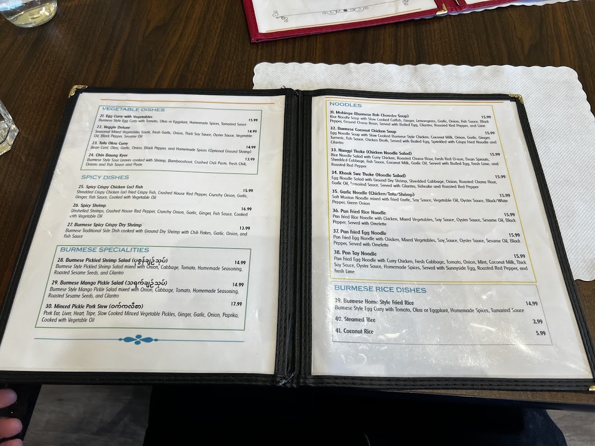 For those seeking refreshing beverages, the restaurant offers classic cold drinks like A&W Root Beer, Coca Cola, and Sprite, perfect for pairing with any dish. The Burmese curries, a staple of the restaurant’s menu, include delicious options such as Shrimp Curry with Vegetables and Chicken Curry, both served with Steamed Rice for a comforting meal. Additionally, the Egg Curry with Vegetables and Chicken Kebab are also flavorful choices that add variety to the curry offerings.